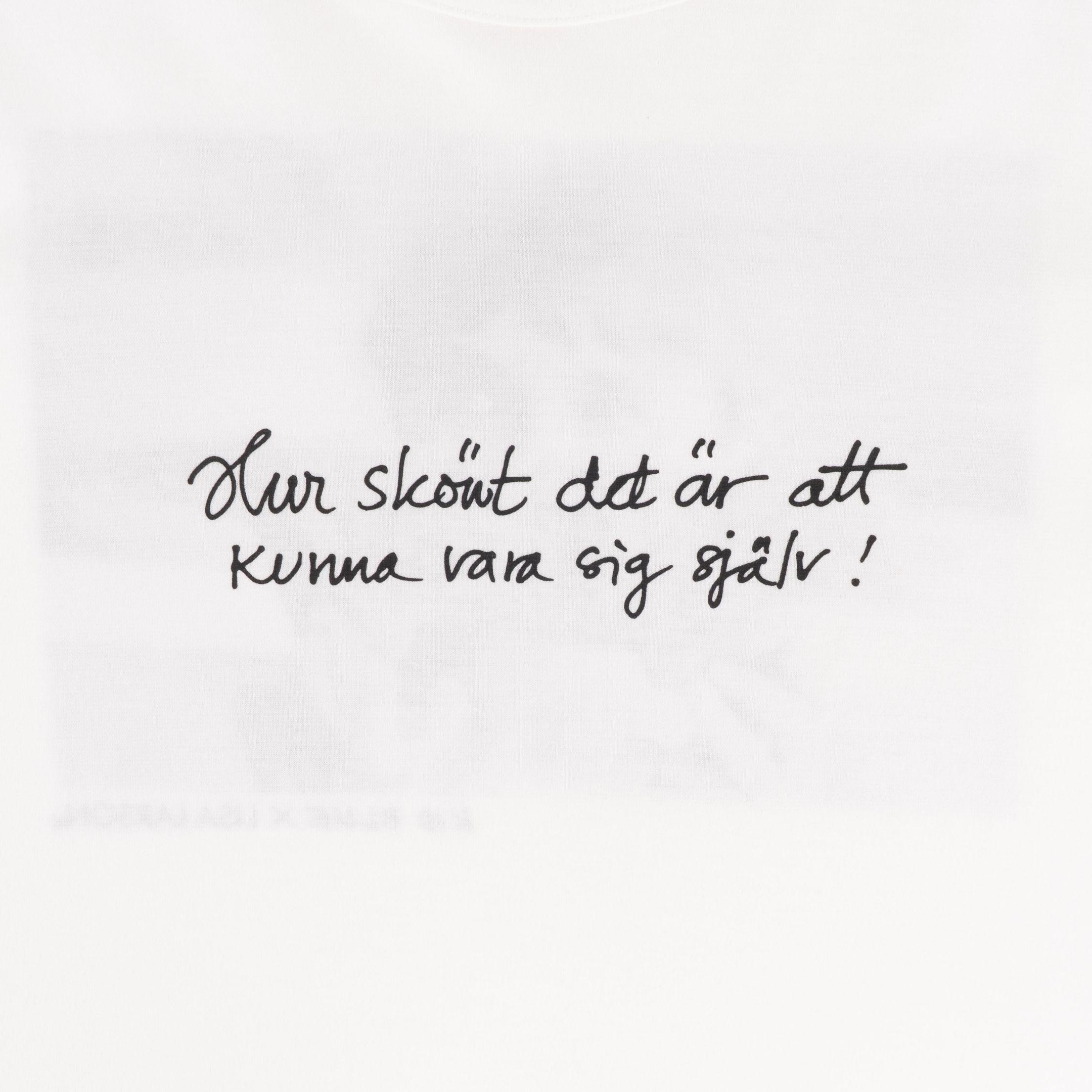リサの娘でありデザイナーでもあるヨハンナが書き下ろしたスウェーデン語のメッセージ入り。 トレンド感のあるショート丈と、ゆったりとしたリラックス感のあるオーバーサイズの2型展開です。 シルケット加工のため、綿100%でありながら、さらりとした肌ざわりに仕上がりました。