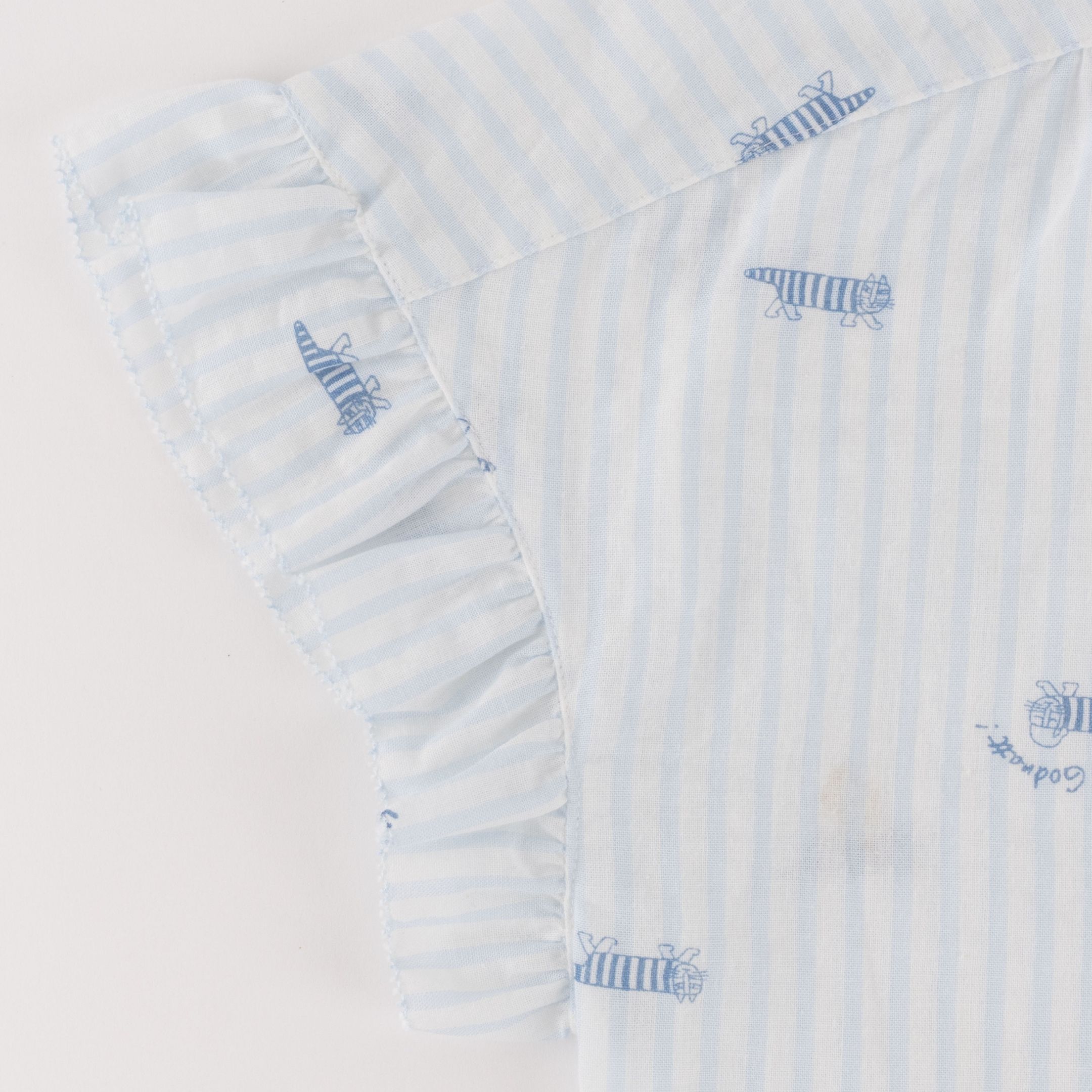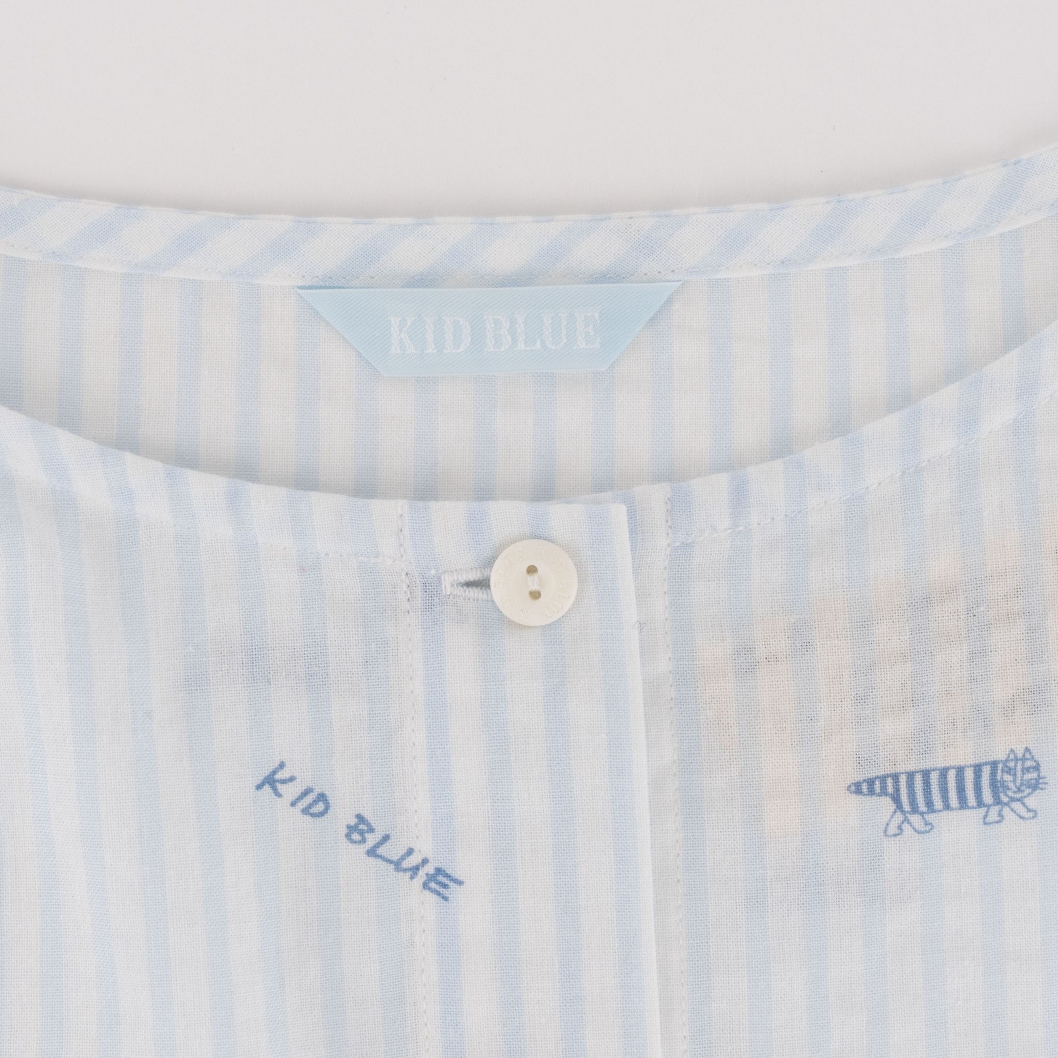 マイキー×KBストライプの生地を使用。袖のフリルや襟元のパイピングなど細部のデザインにもこだわりました。綿とレーヨンの収縮差により、生地の表面に小さな凸凹が生まれ、通気性が良くさらりとした着心地がうまれました。