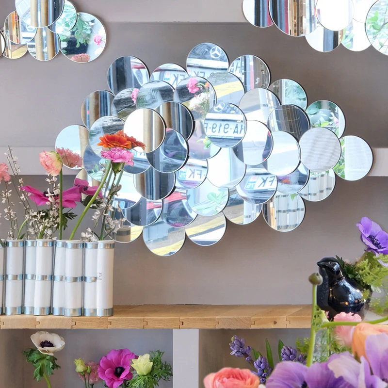 It is a cloud that reflects the world made of 43 mirrors. If you stand in front of this mirror, you will be broken down and reflected in various factors. Where are you real? Please do not find anything. The mirror knows that you are not any real you. As long as there is light there, the mirror cloud will continue to attract you. It is a magical mirror that changes the landscape forever, like a flowing cloud. (43 sheets φ9cm)