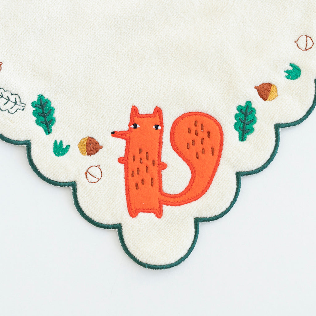 シリルのアップリケ刺繍がポイント。毛並みもしっかりと表現されています。 一般的な四角形ではなく、縁がスカラップになっているのもさりげないポイントです。