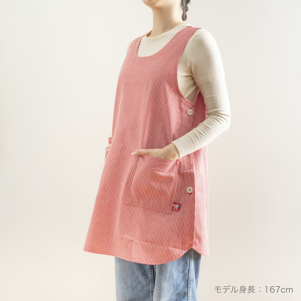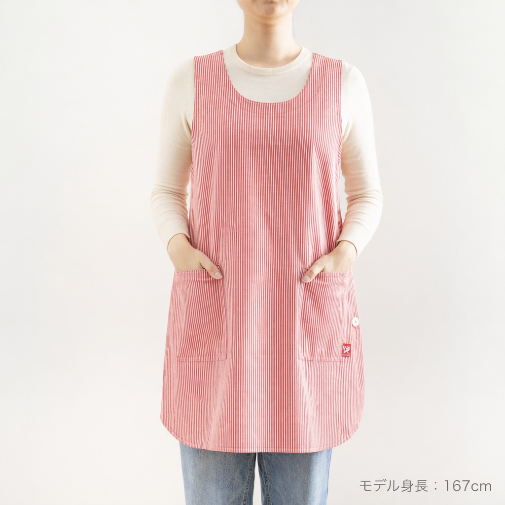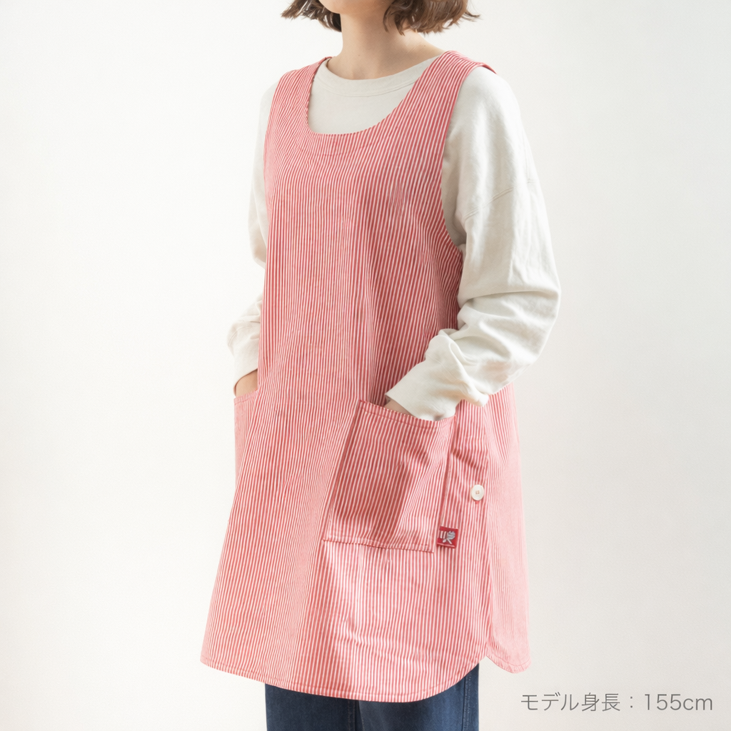 すっぽりと上から被るだけで着脱できる、安定感抜群のデザインです。背中全体をカバーするデザインで、背当てもついているので丈夫で安心。右ポケットの上にはタオルをかけられるループがついています。