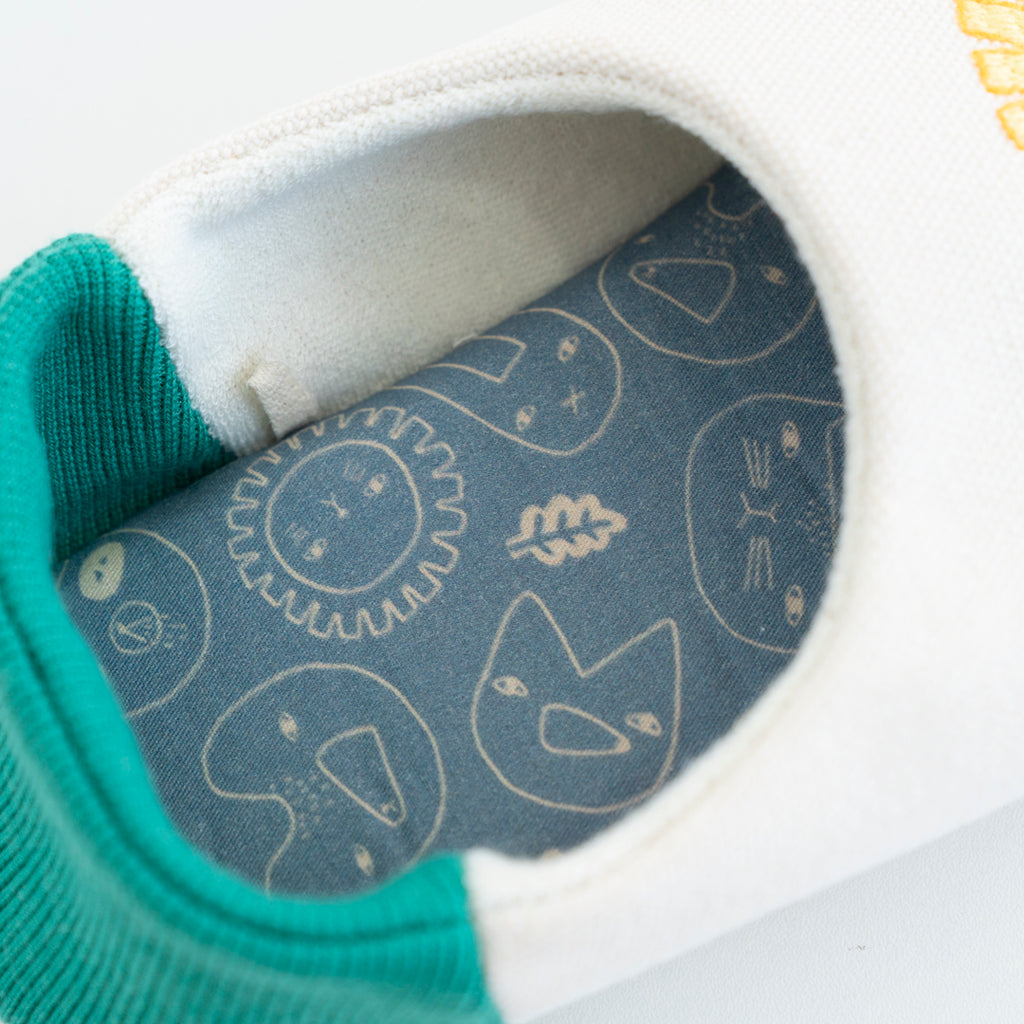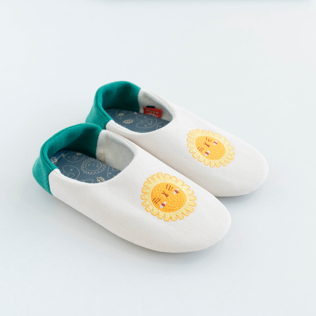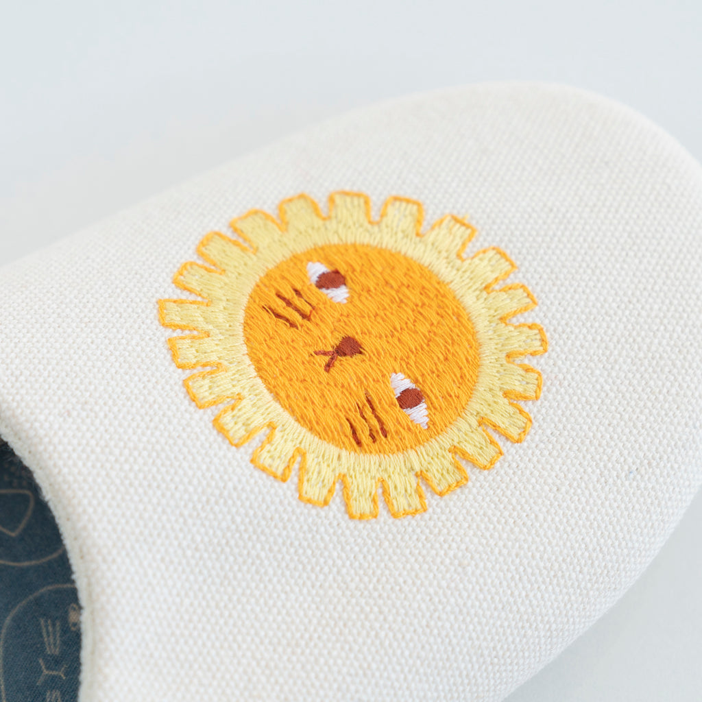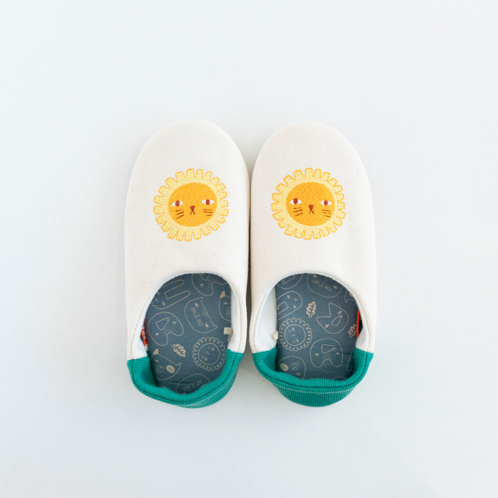 リッチーの顔を丁寧に刺繍で表現したデザイン。底面にもクリーチャーのプリントが施されており、脱いだときにも楽しい一足です。落ち着いたカラーリングで、インテリアにもなじみやすい印象に仕上がっています。