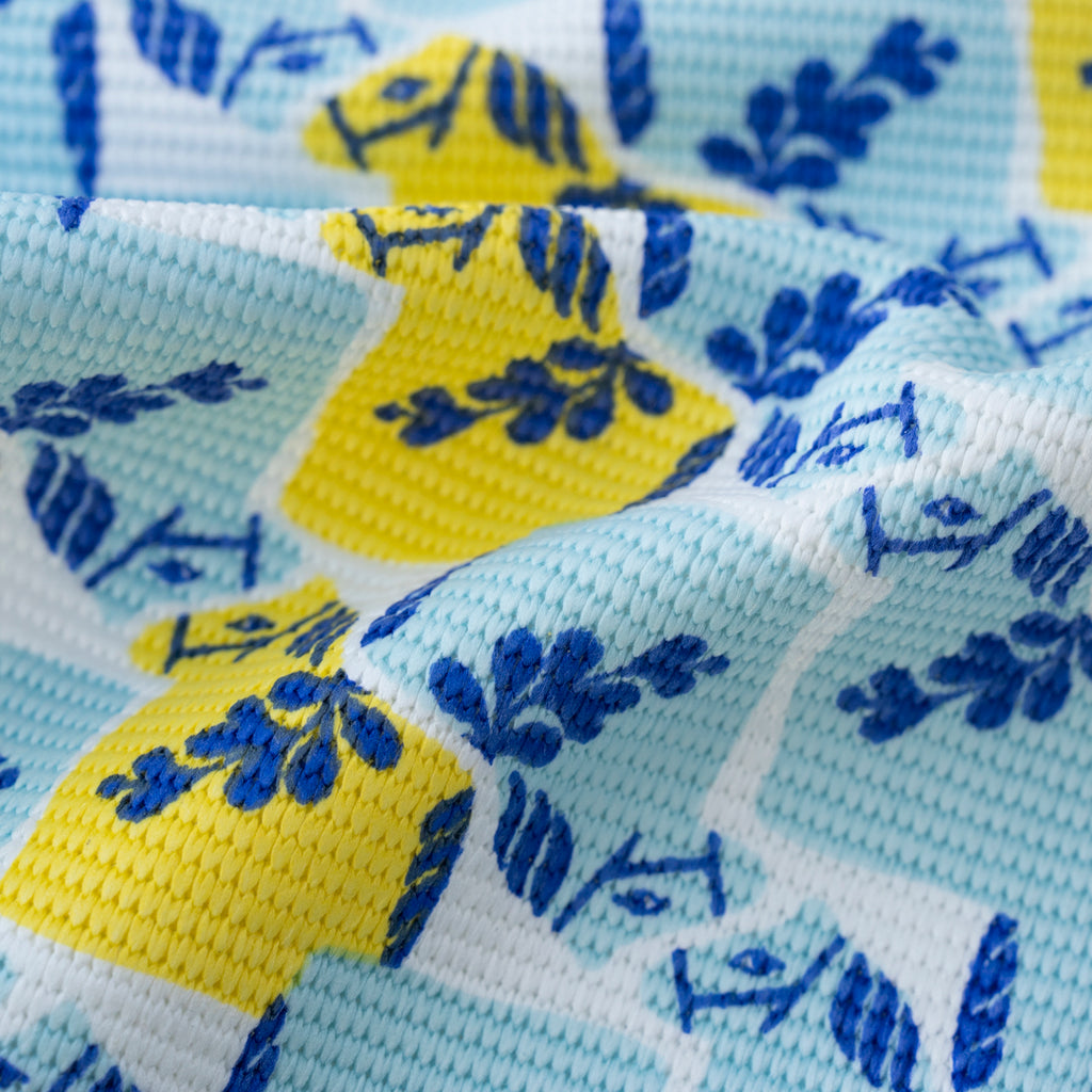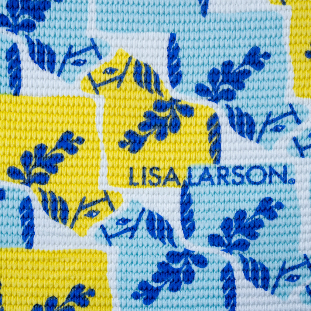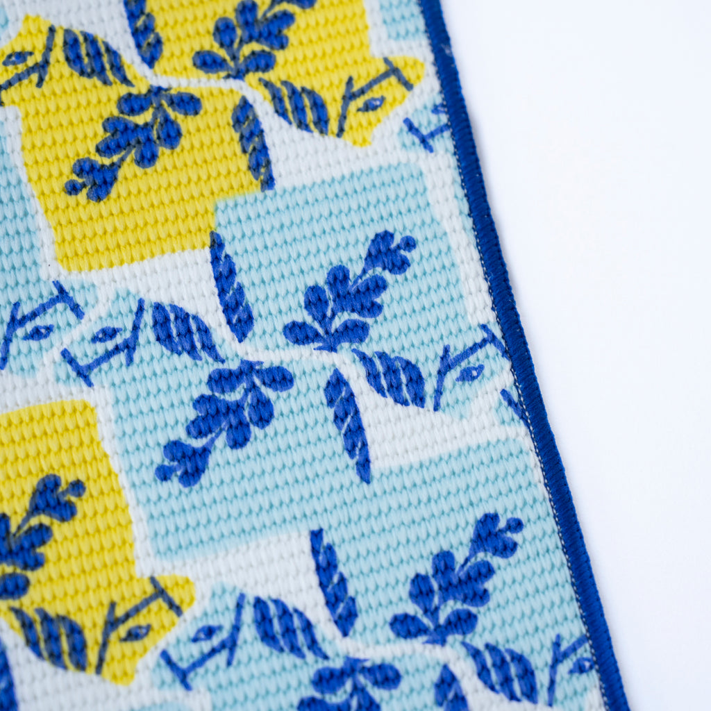 青と黄色の2色の午(うま)が幾何学的なパターンになりました。キッチンが明るくなる、元気な黄色とブルーの組み合わせが楽しいデザインです。