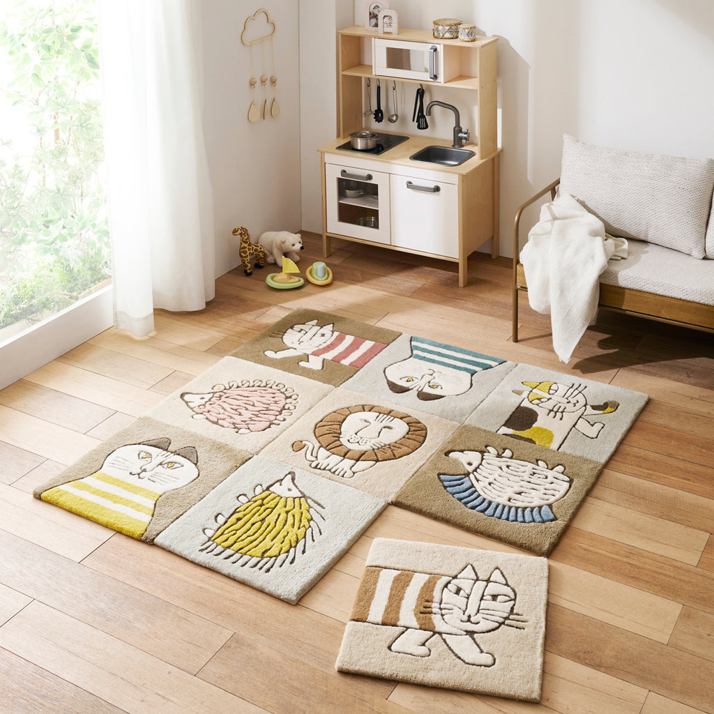 やさしいペールトーンの配色がかわいらしく、敷くだけでお部屋があたたかい雰囲気に。