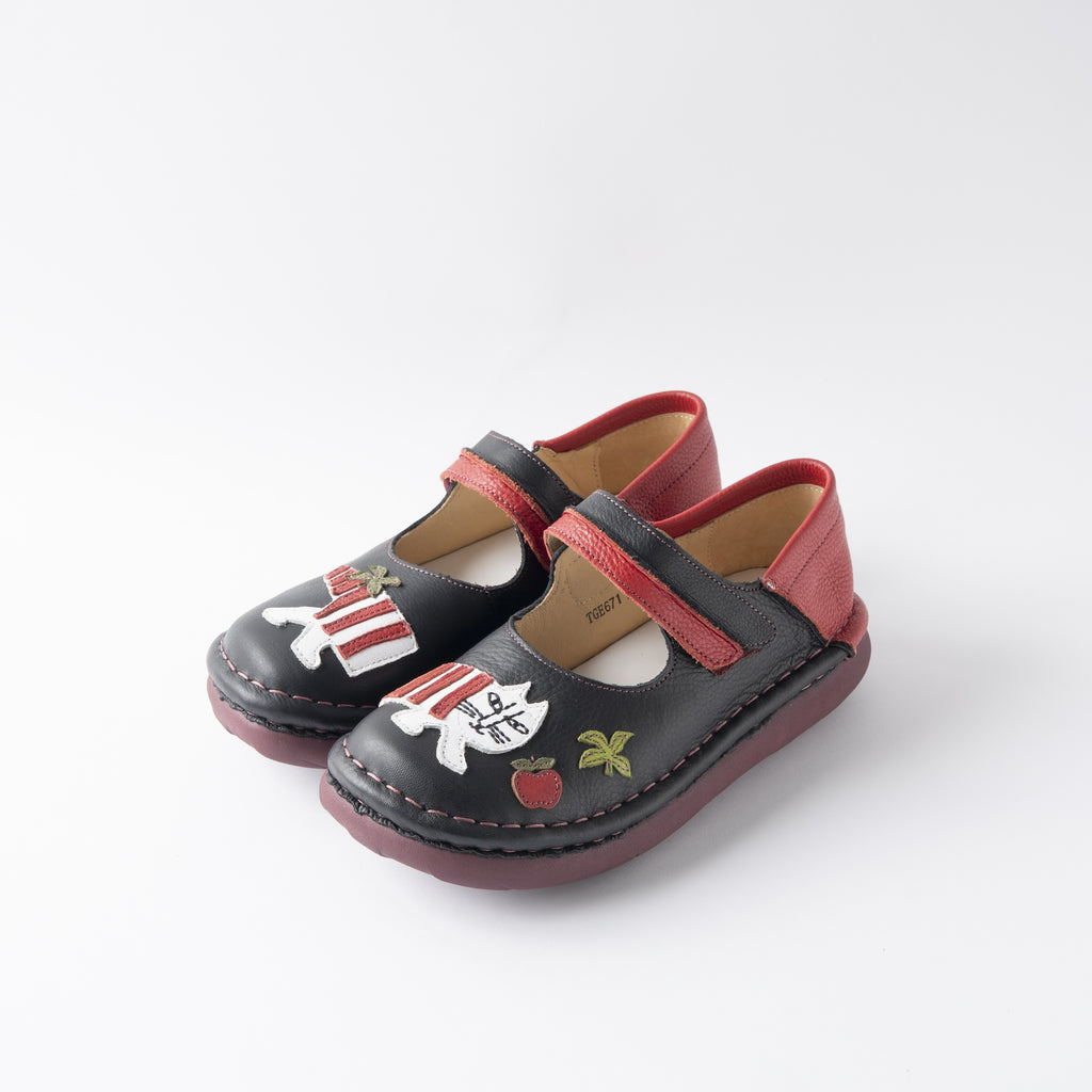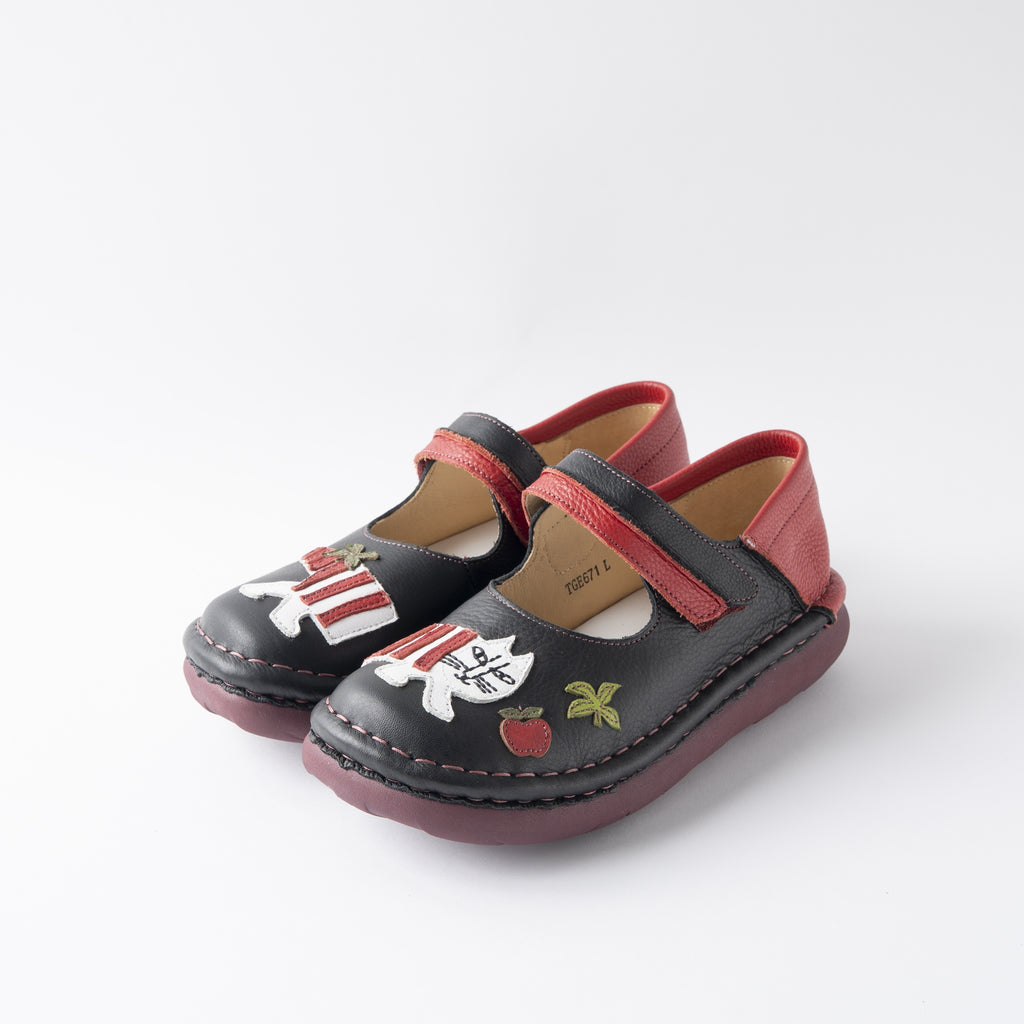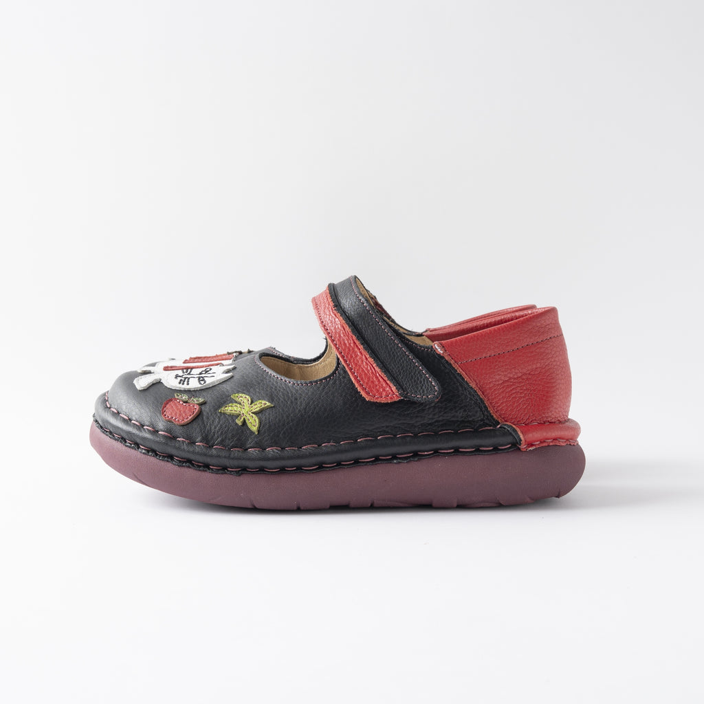 職人の手で一針一針、5層ソールと本体を手縫いしています。ハッピーテイストで温もりのある世界観に癒されながら、足元をポップに彩ります。