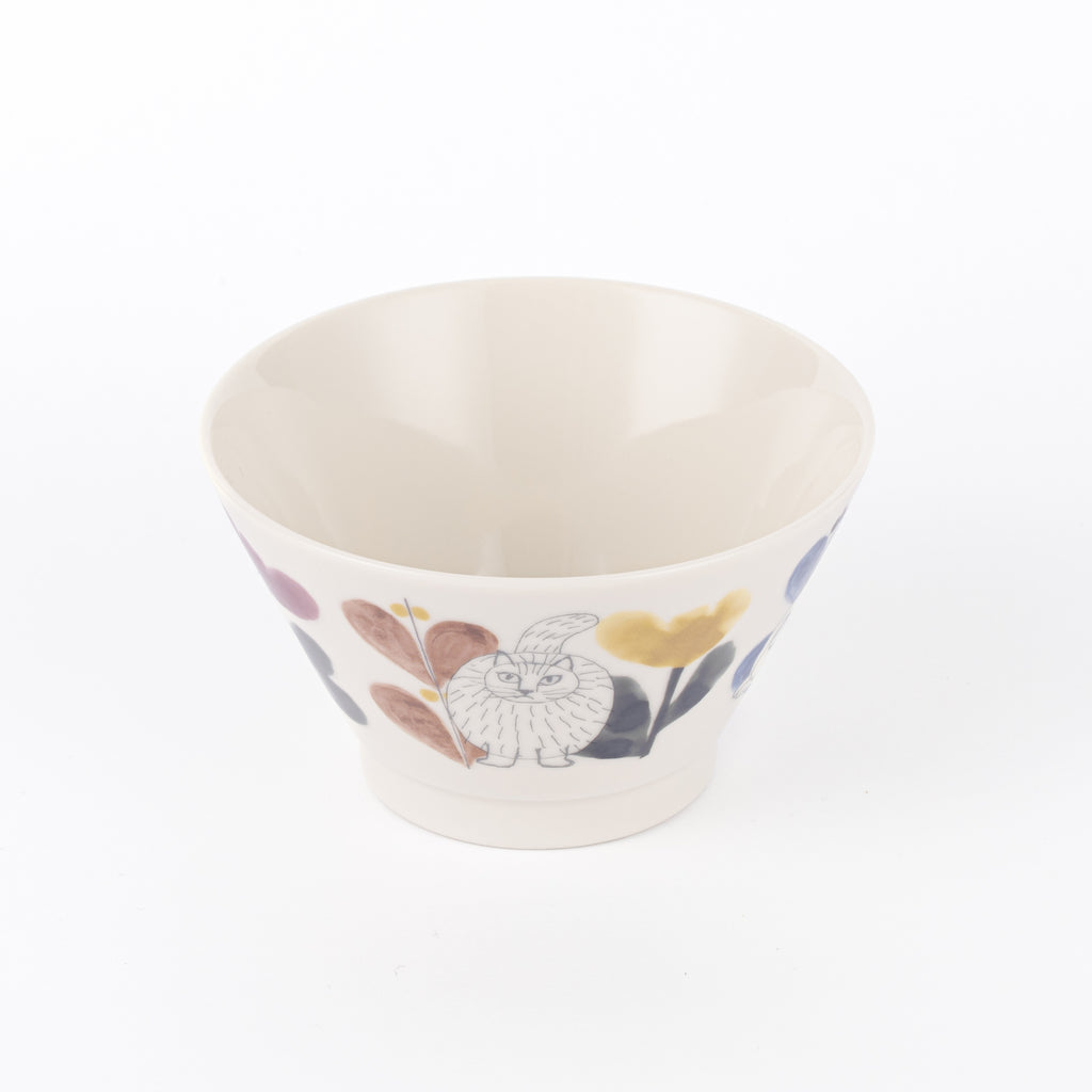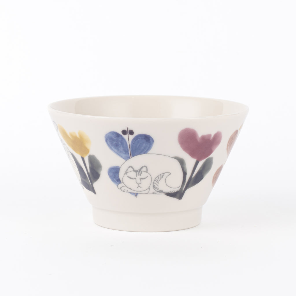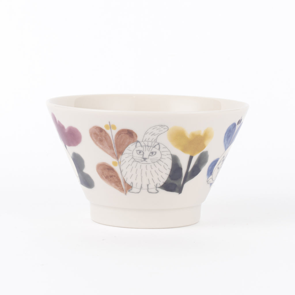 個性豊かなねこたちが、器をぐるりと囲むように草花の間で思い思いに過ごしている姿が描かれています。艶感のある釉薬が、食卓に品の良い輝きを添えてくれます。