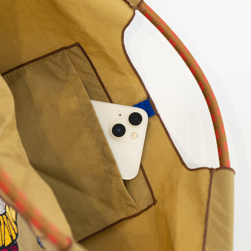 バッグ本体の生地には、耐久性・撥水性に優れた厚手のナイロン素材を使用。多少の雨や水滴をはじくため、天気が不安定な日のお買い物にも安心です。