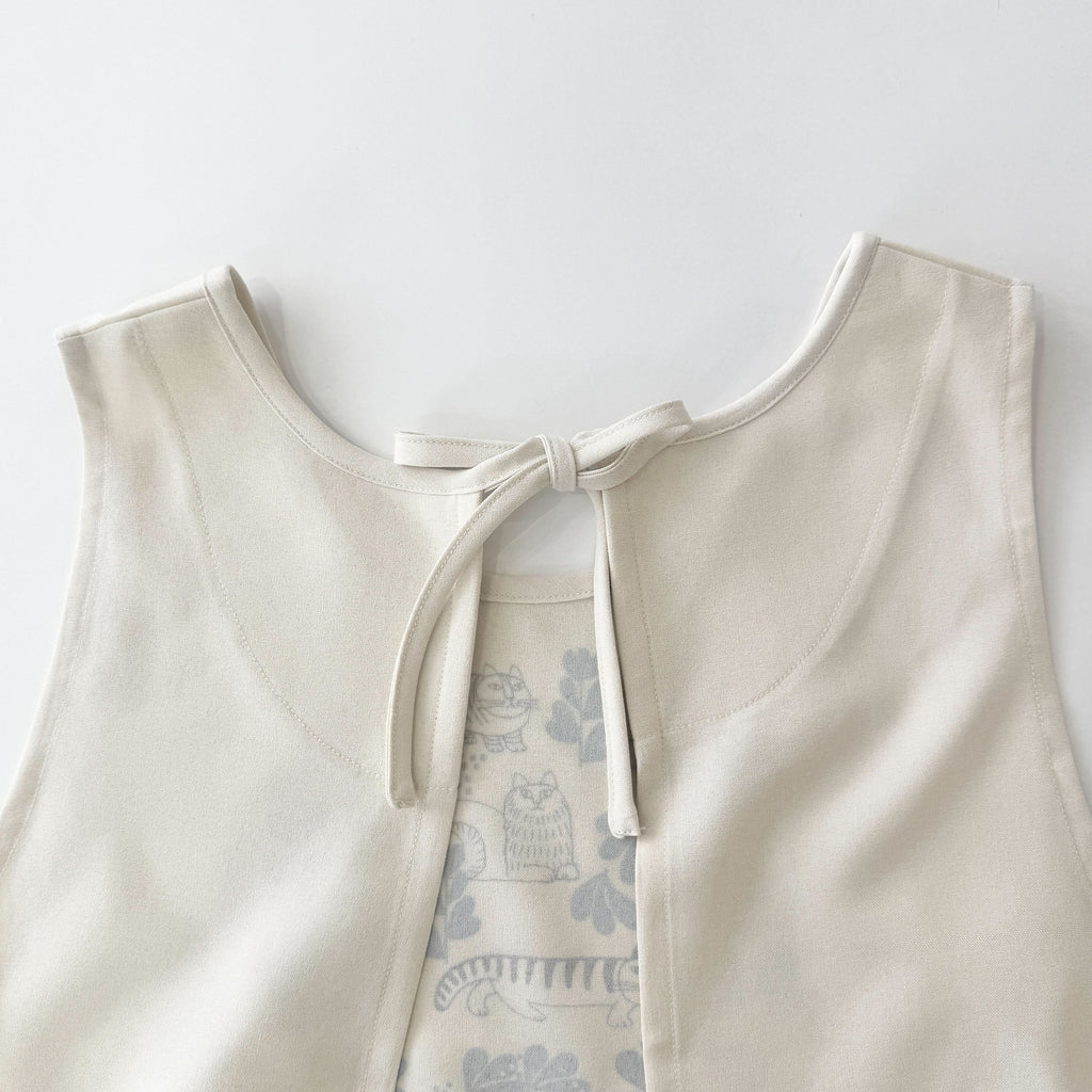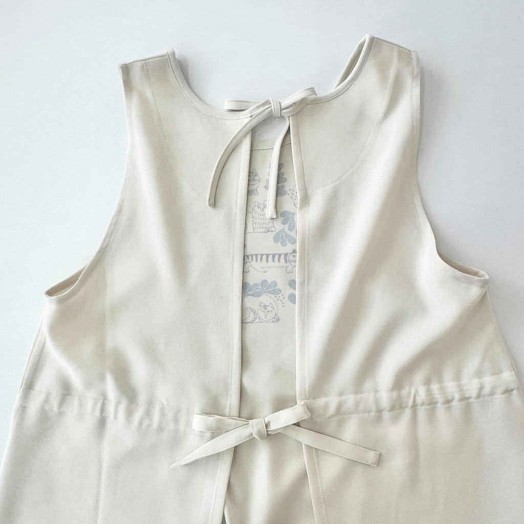 肩紐が太めで安定感があり、肩から落ちにくいのが最大の特徴。重さが分散されるため、長時間着用していても体に負担がかかりにくい、優しい設計です。 背面は首の後ろの紐と腰紐で開閉するタイプで、腰紐の絞り具合で、自分好みのサイズ感に調整が可能です。クロスエプロンの機能性と、ワンピースのファッション性をいいとこ取りした一着です。