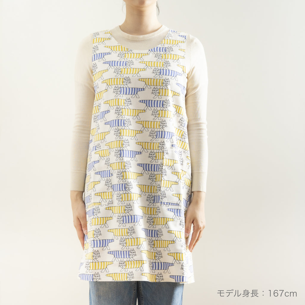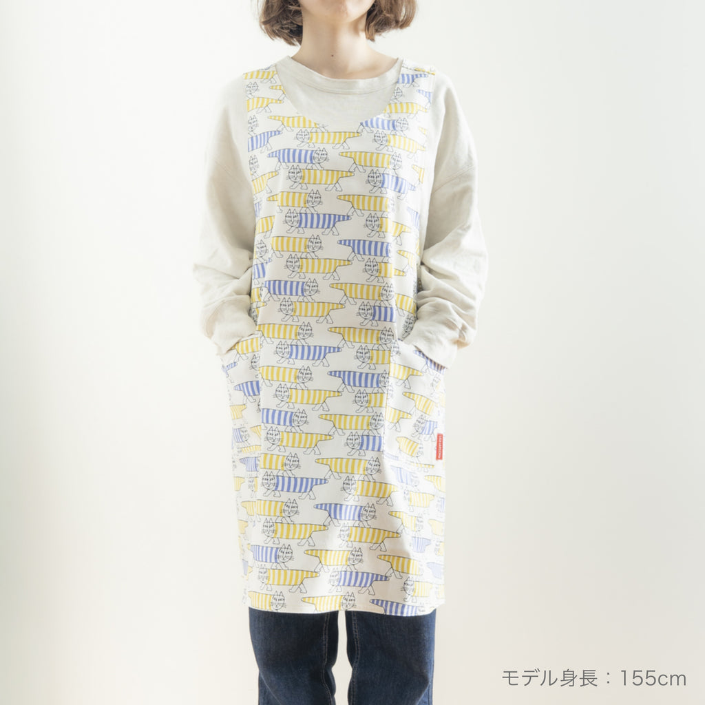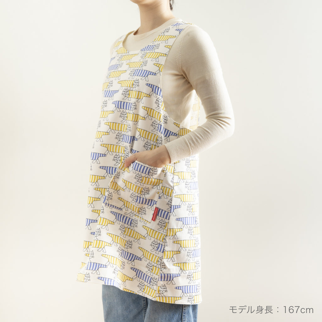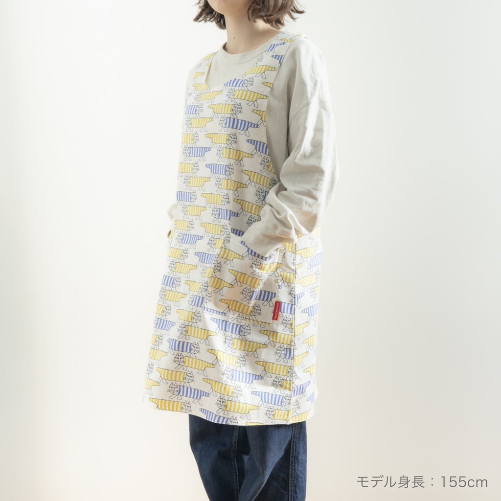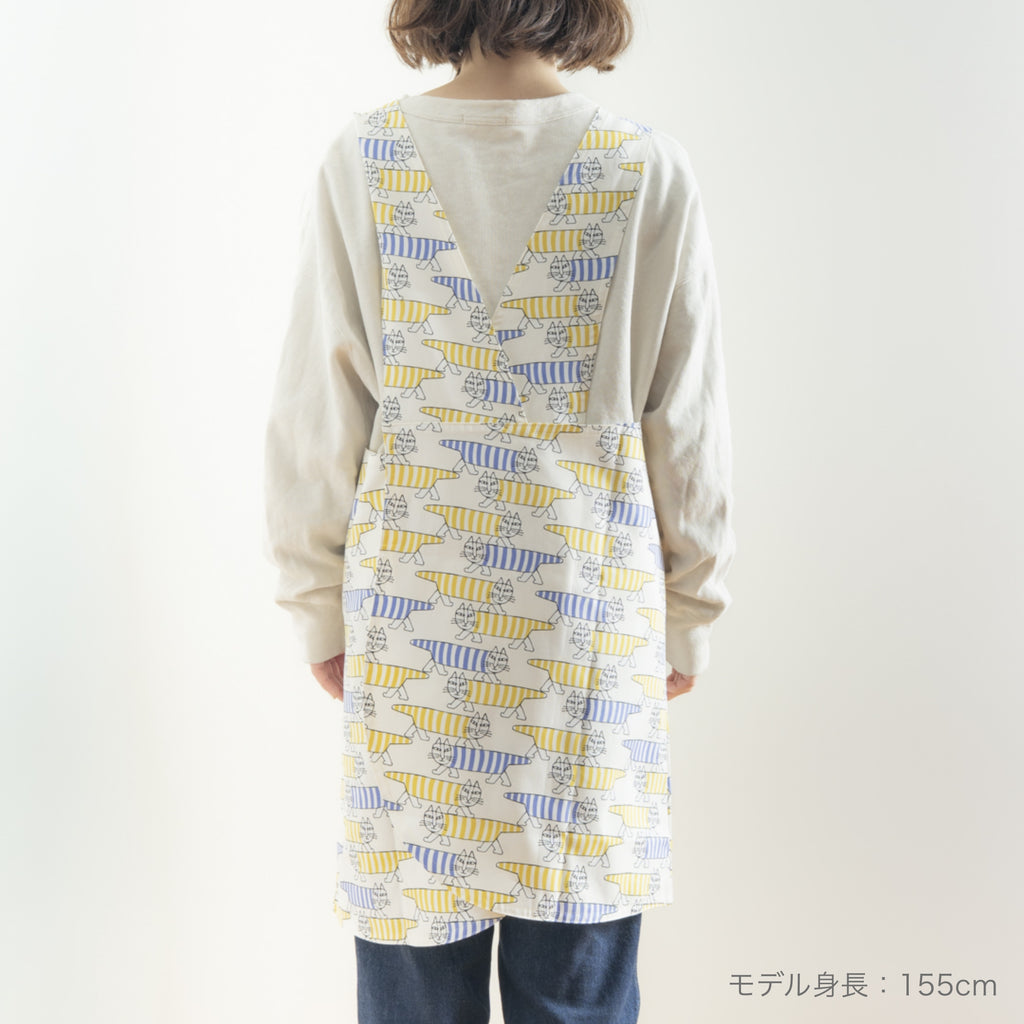 紐もボタンもなく、背中のクロス部分からすぽっと被るだけで着用できる、究極にシンプルなエプロンです。