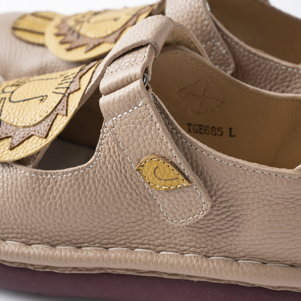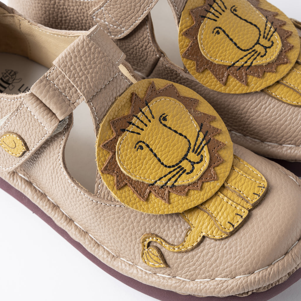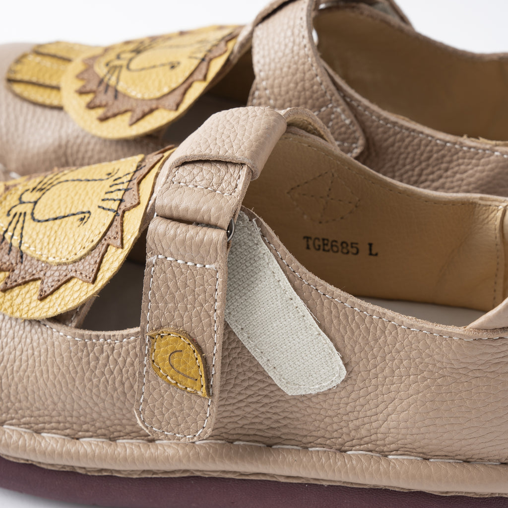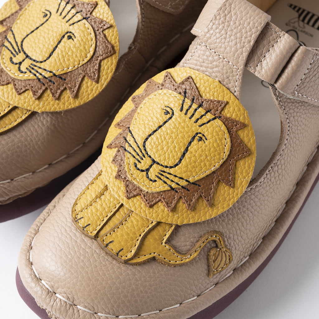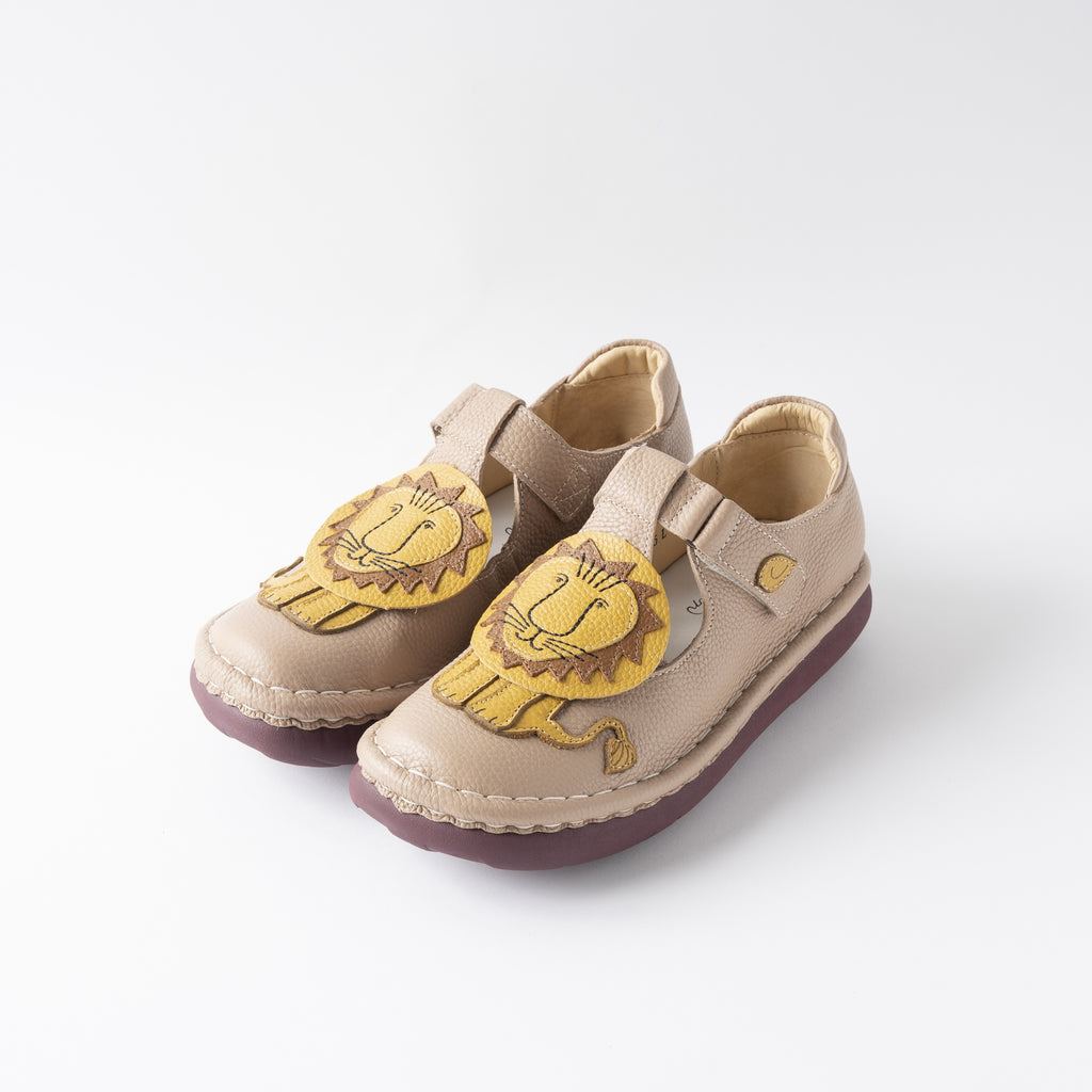ひとつひとつ丁寧に縫い合わせたライオンモチーフのデザインに、ころんとした丸みのあるフォルムが愛らしく、マジックテープ仕様で着脱もスムーズ。足にやさしくフィットし、歩きやすさにもこだわった一足です。