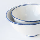 マリアンヌの手作業の跡が再現できるように、ちょうどいい歪(いびつ)さを探しました。普通のまん丸に成形されたお茶碗などと比べてもらうと、すぐにその違いが手のひらと指先から伝わってきます。ふちの部分と高台に縁(ふち)部分に、マリアンヌブルーの線を入れただけの最小限の装飾を施しました。上から見ると、この丸は月のようにも見えますが、この器シリーズは、口をあけた空白を意味していて、食べるものを素直に受け入れて引き立て、あなたのお腹に届けてくれます。