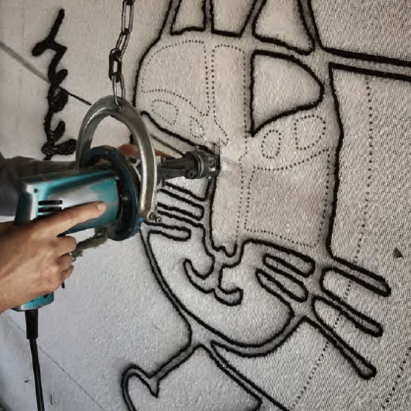 型紙で下絵を描いた後、職人が電動フックガンを使って一本一本糸を通していく、手間のかかる工程です。近年ではこの技術を持つ職人が減少し、希少な製法となりつつあります。