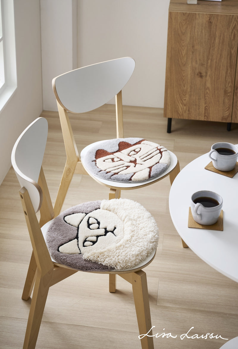 お顔の下のふさふさを、つい撫でたくなるようなやわらかさです。おそろいのチェアパッドもご用意しました。