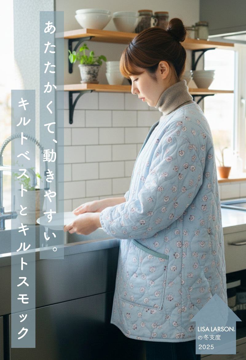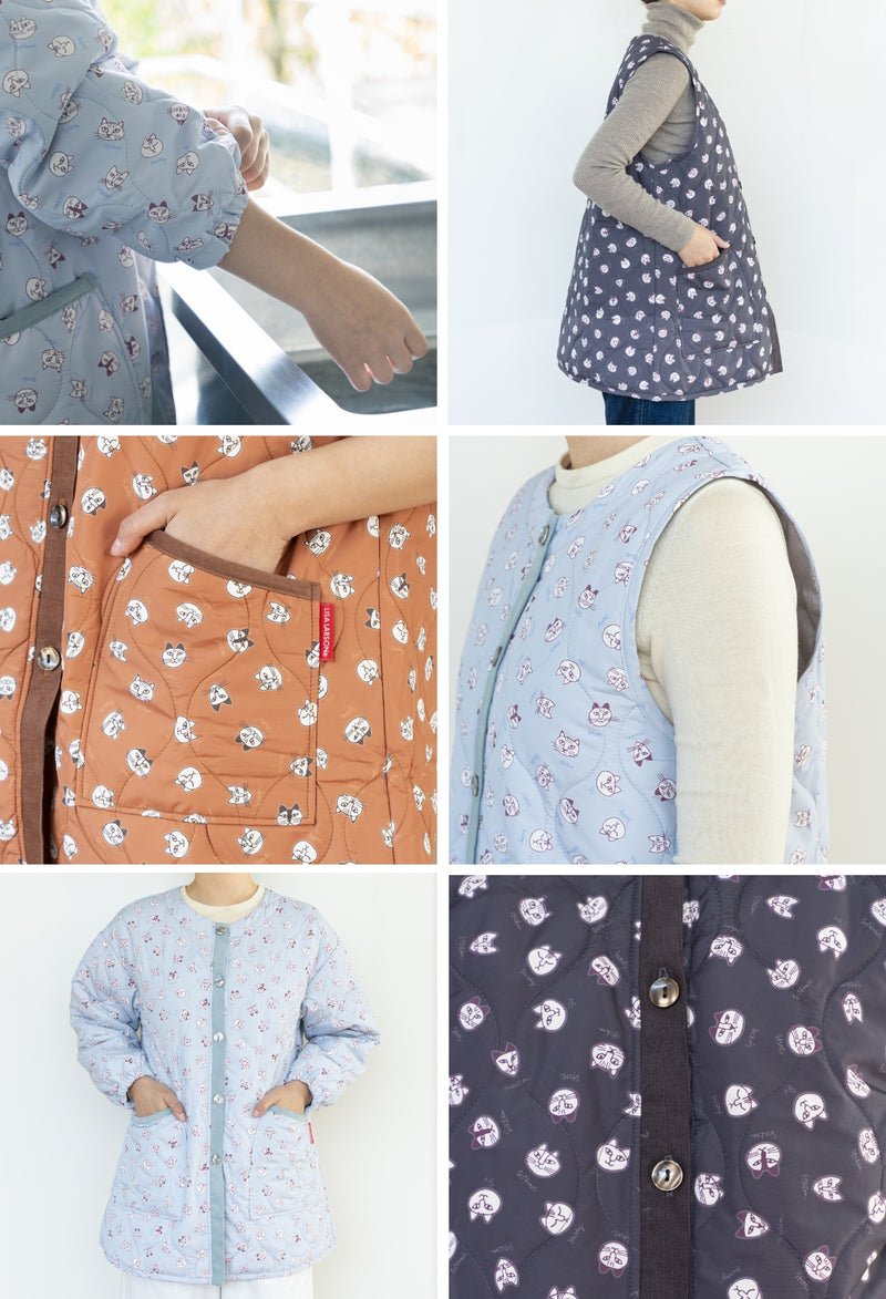 冬のおうち時間にぴったりの新定番、キルトベストとキルトスモックができました。