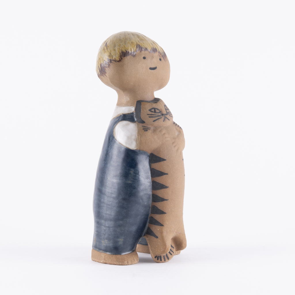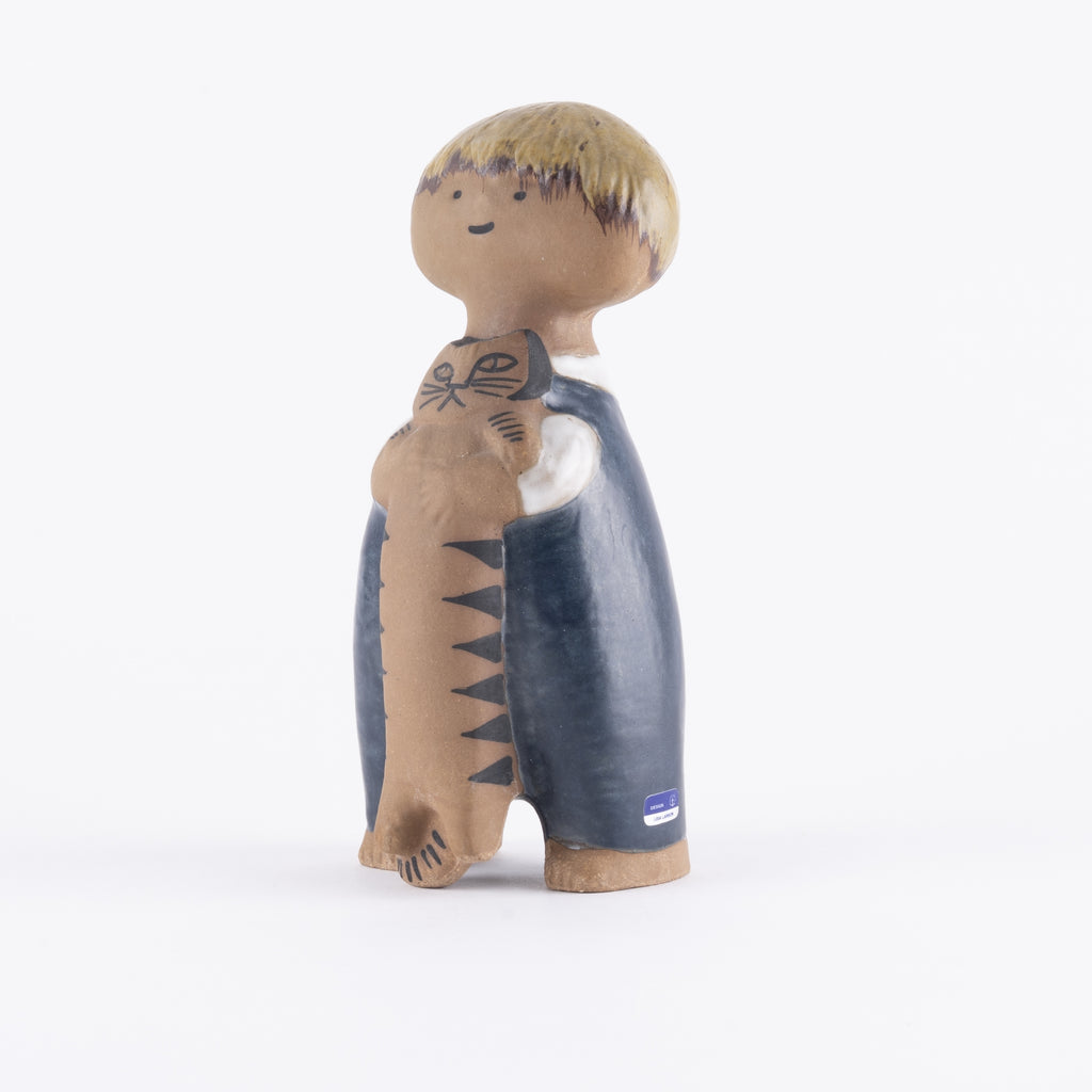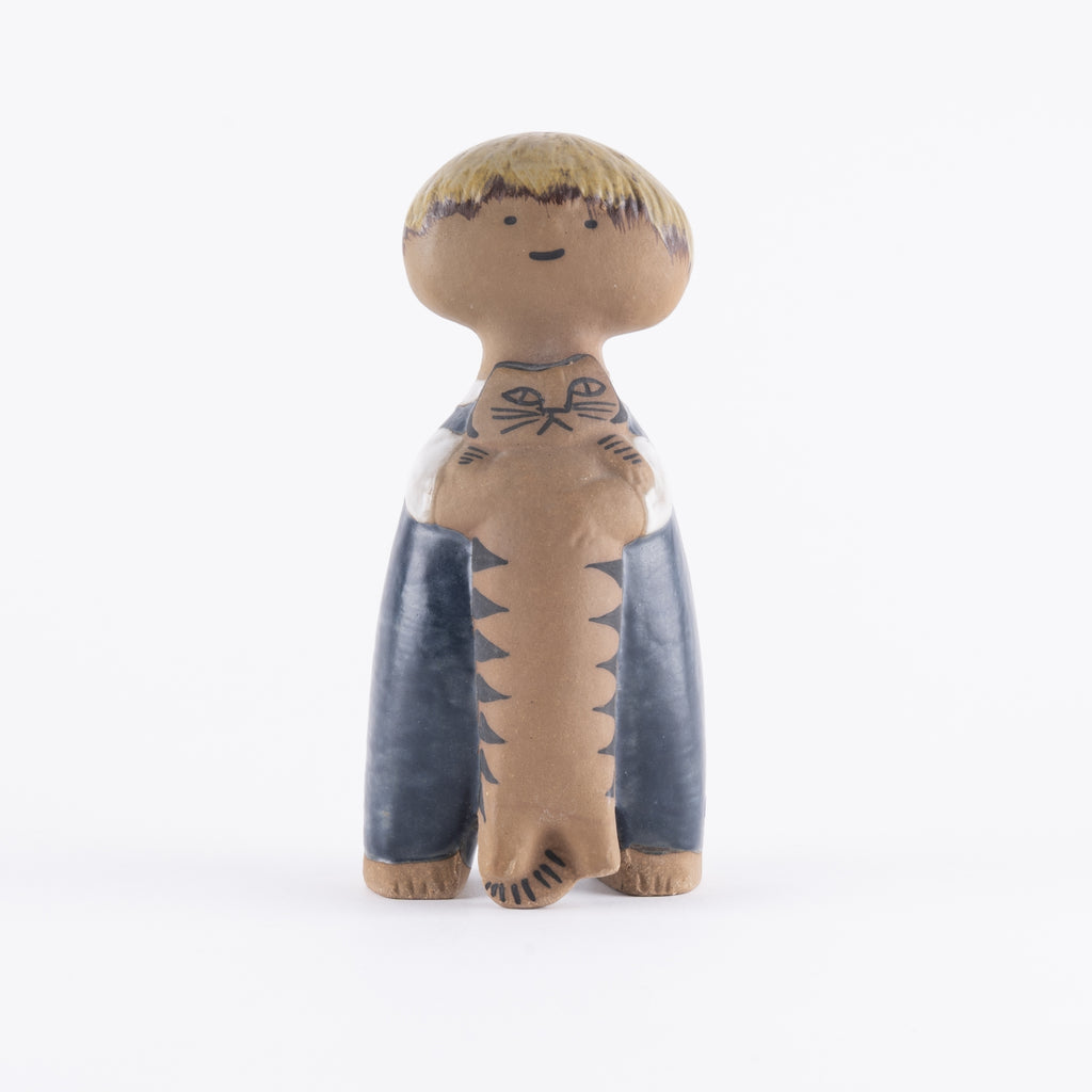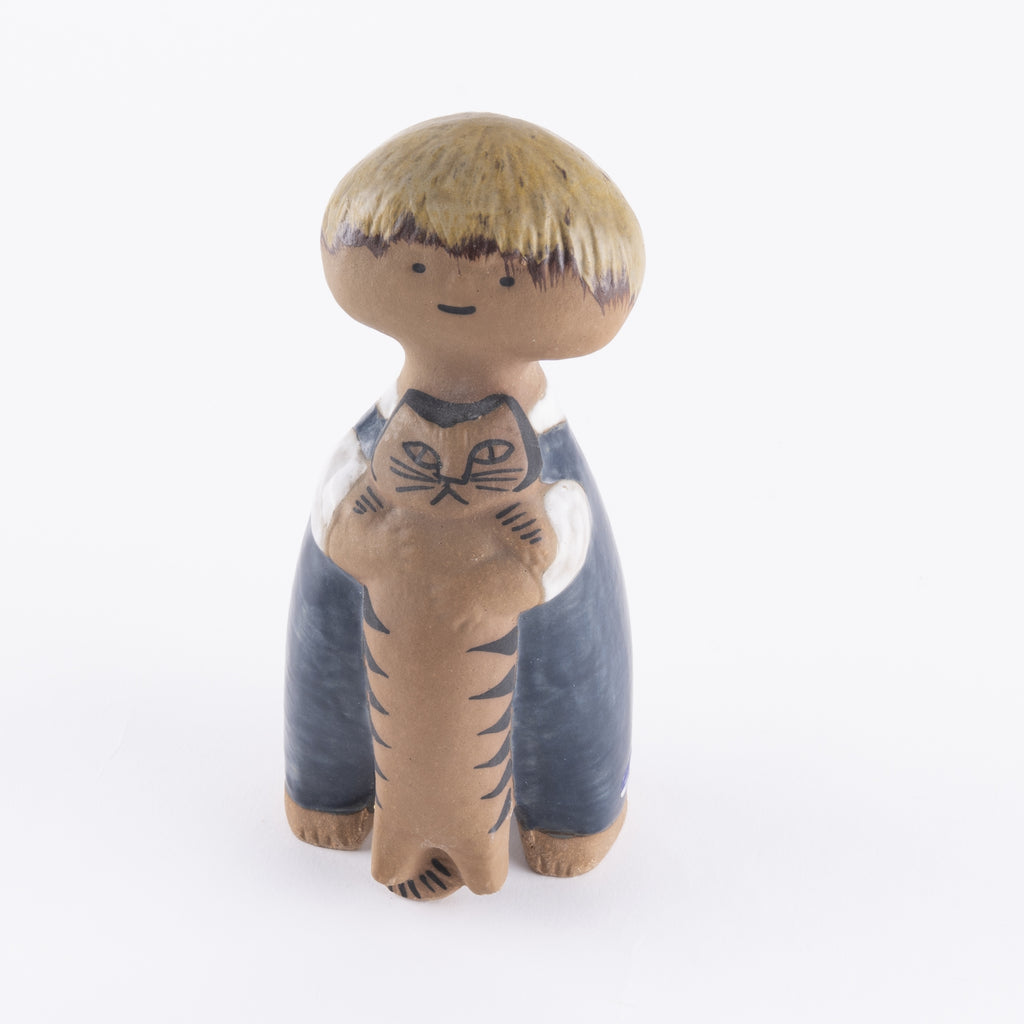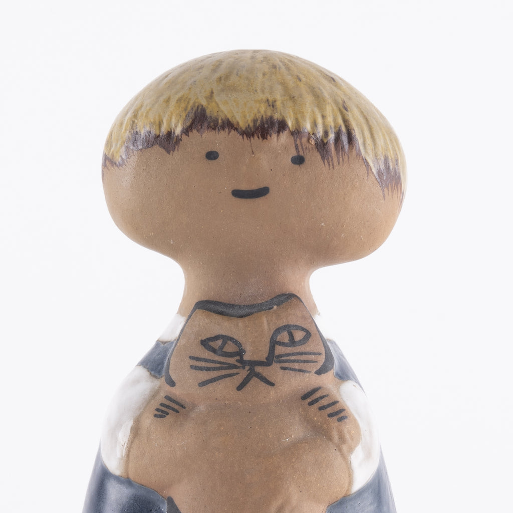 佩爾(Pelle)和一隻脾氣暴躁的貓在他面前握在他面前,笑容和和平的表情。 Kokeshi No Pele的原始作品,日本麗莎·拉爾森(Lisa Larson)系列。 Shamot製成的自然質地,表達溫暖。 “拉爾森兒童系列”由六人組成,Calle Johanna Susan Lotta Lotta Merlin Pelle。