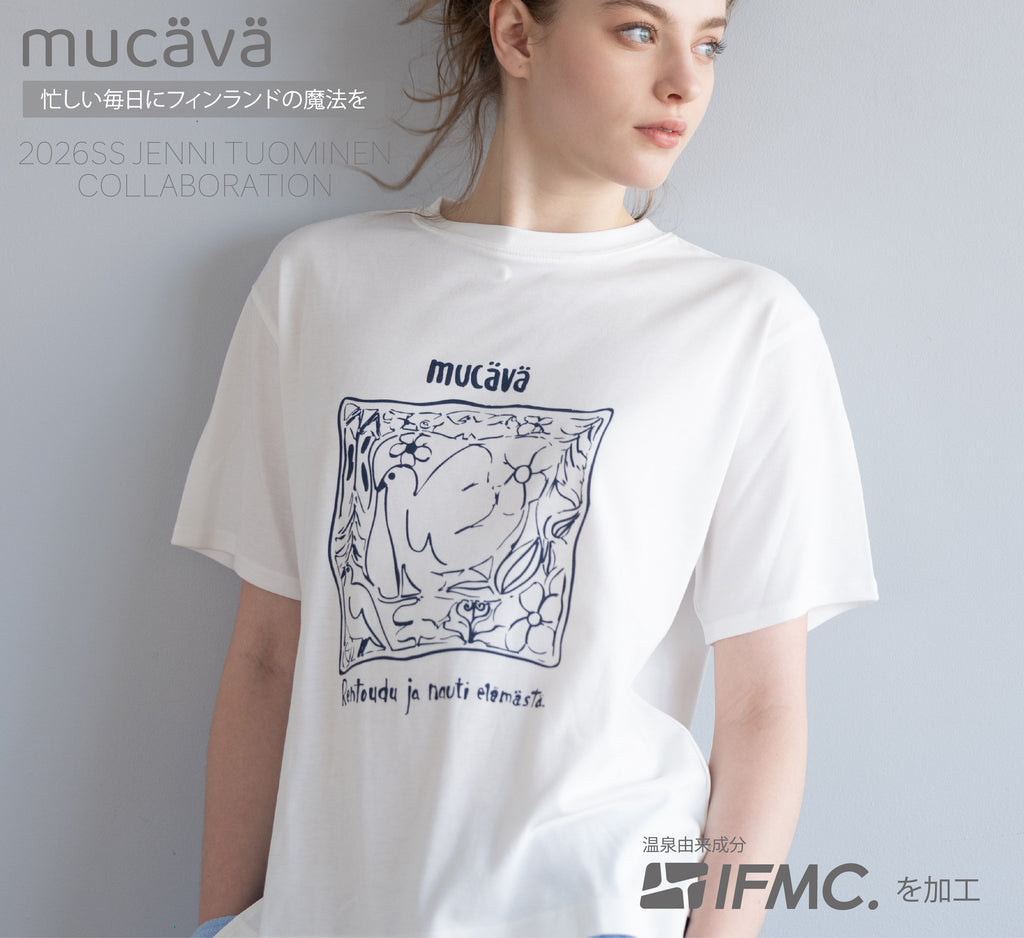 「mucava」は、フィンランド由来のデザインを取り入れたワンマイル・ルームウェアブランド。着るだけで血行促進が期待される「IFMC.(イフミック)」加工の生地を使用し、日々のリラックスタイムに寄り添うアイテムを展開しています。