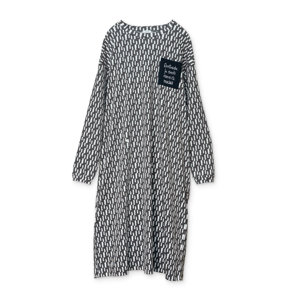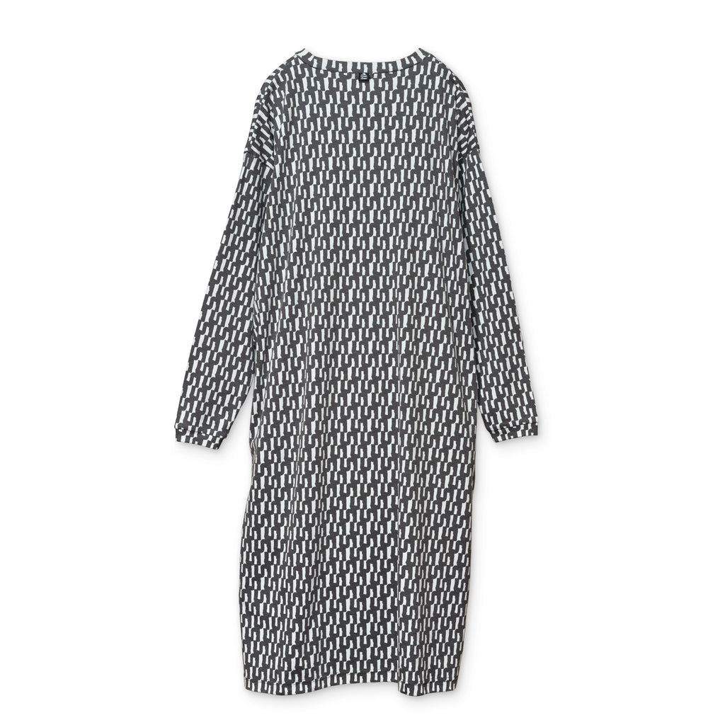 バイカラーで大胆なグラフィックを配したワンピース。 フィンランドのアーチスト、イェンニ・トゥオミネン描き下ろしの柄を採用。 幾何学的なフォルムと計算された配色で、総柄でも上品にまとまる一枚です。