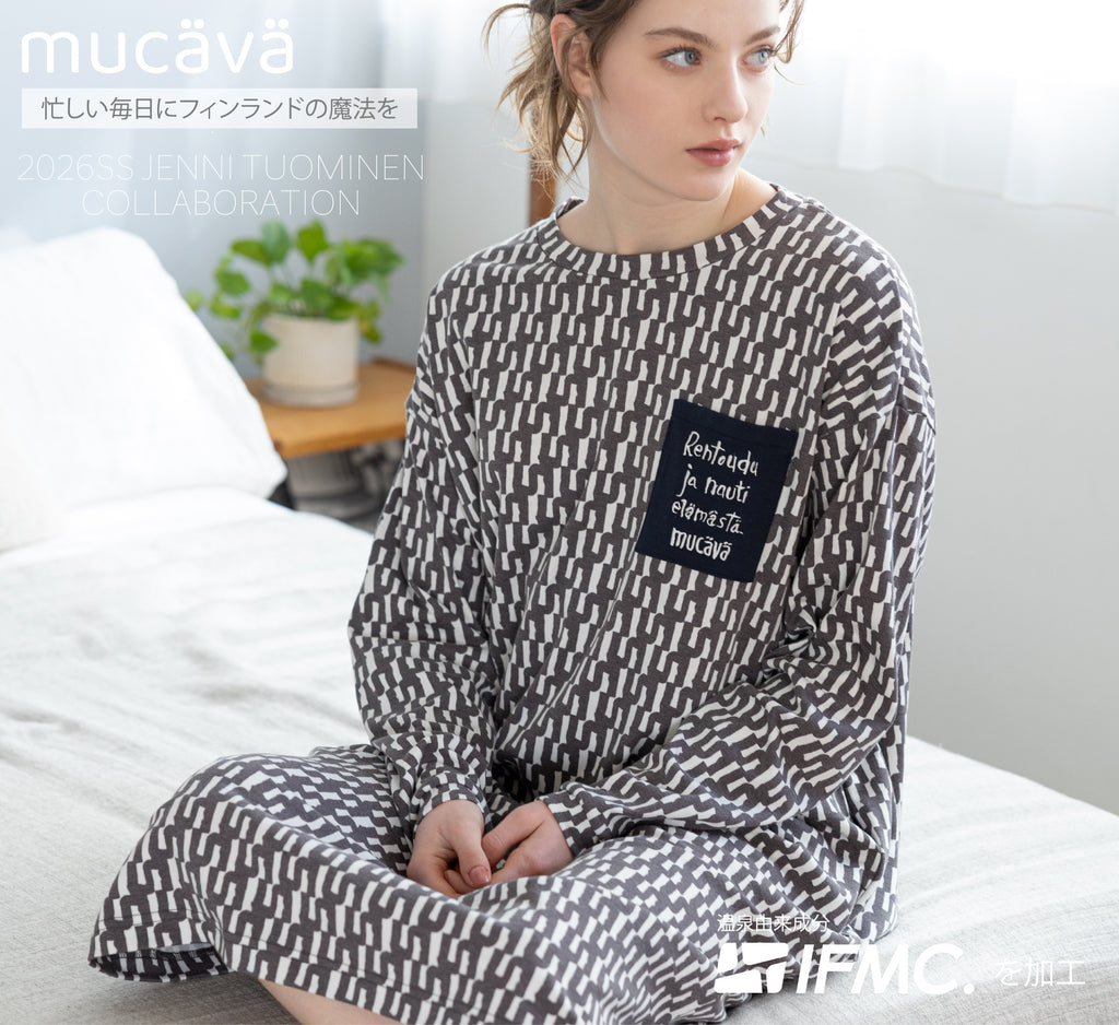 「mucava」は、フィンランド由来のデザインを取り入れたワンマイル・ルームウェアブランド。 着るだけで血行促進が期待される「IFMC.(イフミック)」加工の生地を使用し、 日々のリラックスタイムに寄り添うアイテムを展開しています。